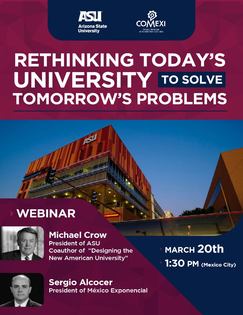 Para que nuestras sociedades sigan prosperando, las universidades del siglo XXI tienen que educar a un mayor número de estudiantes y prepararlos para una economía de conocimiento globalizado en constante transformación. Al mismo tiempo, estos estudiantes deben convertirse en protagonistas del desarrollo y bienestar de sus comunidades. Michael Crow, presidente de Arizona State University (ASU), y coautor del libro "Designing the New American University", ha revolucionado el modelo universitario para cumplir con dichos compromisos. Gracias a su labor en Arizona por más de 15 años, ASU se ha convertido en la universidad pública más grande en Estados Unidos, y la más innovadora por cuarto año consecutivo según los rankings de US News & World Report. Los invitamos a platicar con el presidente Crow y Sergio Alcocer, presidente de México Exponencial, sobre el diseño del “New American University” y lo que promete para el futuro.