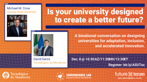 Join Future Tense and ASU’s Convergence Lab for a binational discussion of how Arizona State University and the Instituto Tecnológico y de Estudios Superiores de Monterrey, one of Latin America's most innovative universities, have been addressing the challenge of COVID-19. Presidents Michael Crow and David Garza will compare notes on the lessons of 2020, and explore how universities can continue adapting their design and innovating to create a better future for all.
