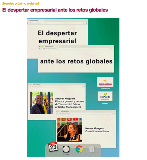 No se resolverán problemas tan complejos como la pandemia del coronavirus y el cambio climático sin la participación del sector privado, tanto en México como a nivel internacional. En este webinar, organizado en alianza con el Consejo Mexicano de Asuntos Internacionales (COMEXI), Sanjeev Khagram, director general y decano de Thunderbird School of Global Management, y Norma Munguía, asociada COMEXI y consultora ambiental, platicarán sobre cómo las empresas deben abogar por la creación de cadenas de valor que permitan fortalecer la conexión entre bienestar económico, social y ambiental. Nos vemos de forma virtual el próximo jueves 23 de abril a las 10 am (CDMX).